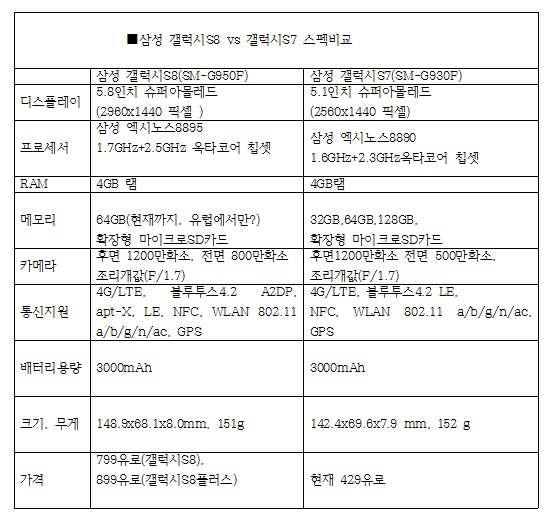 표 갤럭시s8 갤럭시s8 플러스 스펙 전자신문