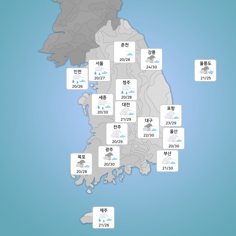 다음주 월요일인 27일 오후부터 목요일인 30일까지는 전국 30일 강원영동과 경남 제주도 제외 에 비가 오겠다.