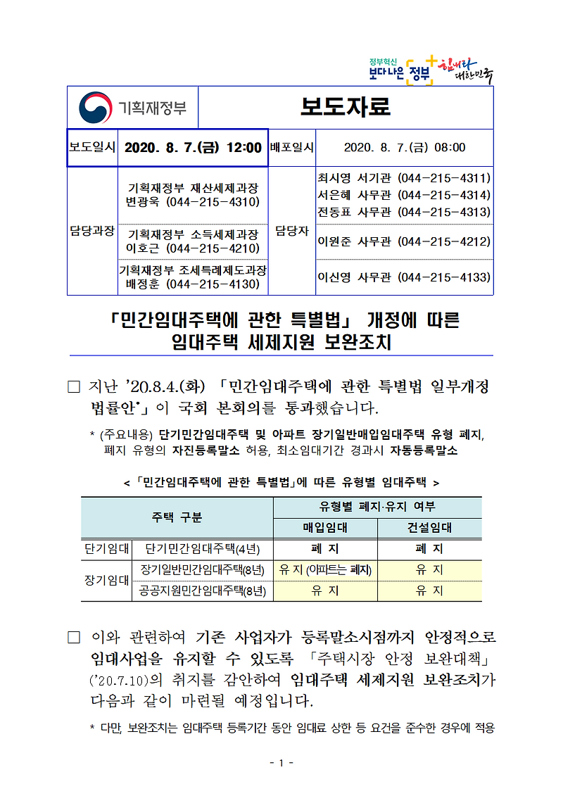 민간임대주택에 관한 특별법 개정에 따른 임대주택 세제지원 보완조치 Aka 8 7대책 1boon