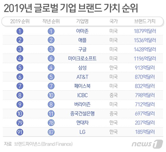 One Shot 2019 세계 500대 브랜드 1위는 아마존 한국 기업 순위는 중앙일보
