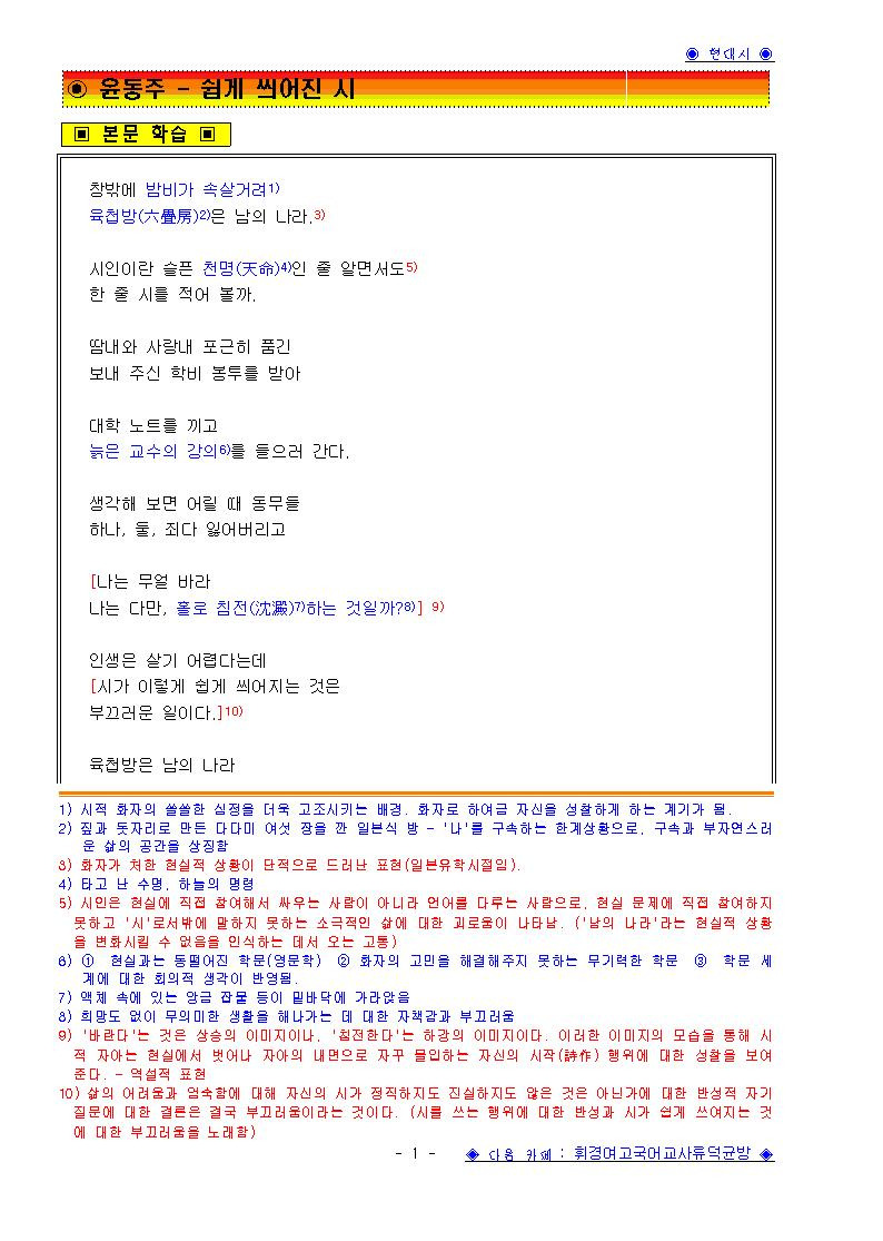 윤동주 쉽게 씌어진 시 해설 및 문제 네이버 블로그