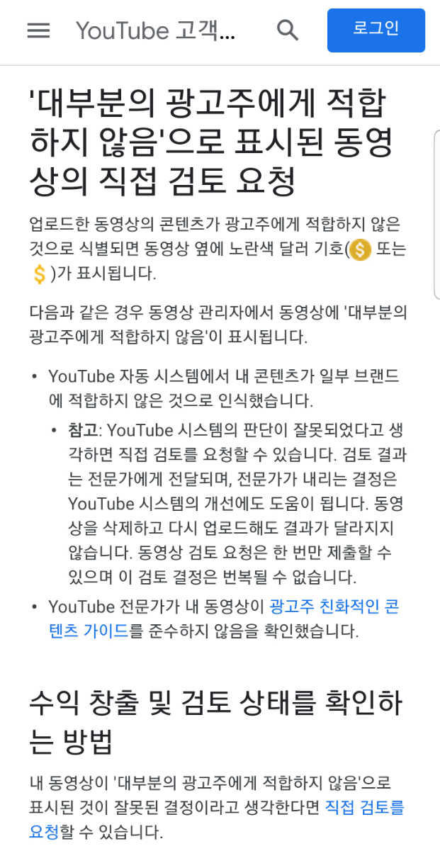 유튜브 노란딱지 대부분의 광고주에게 적합하지 않음 검토요청 하기