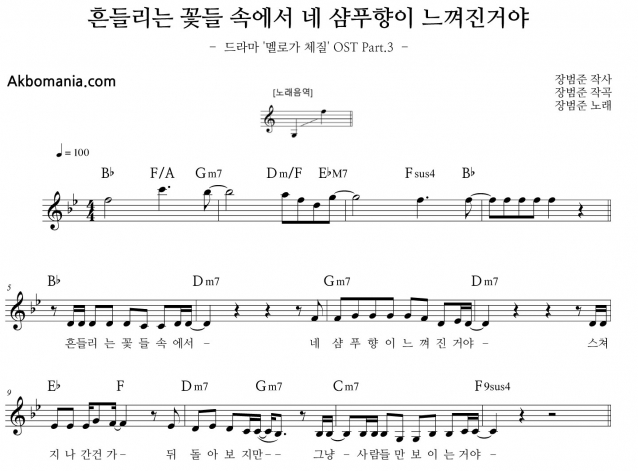 장범준 흔들리는 꽃들 속에서 네 샴푸향이 느껴진거야 동영상 악보 악보바다