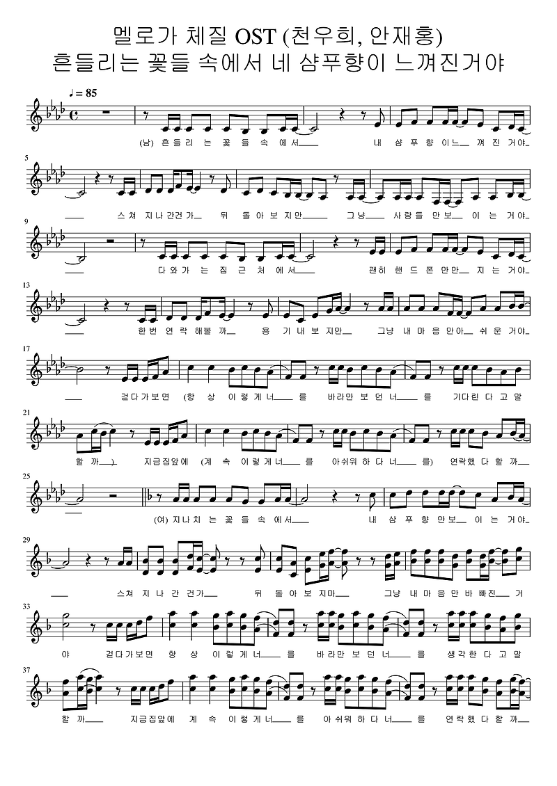멜로가 체질 Ost 천우희 안재홍 흔들리는 꽃들 속에서 네 샴푸향이 느껴진거야 악보다운