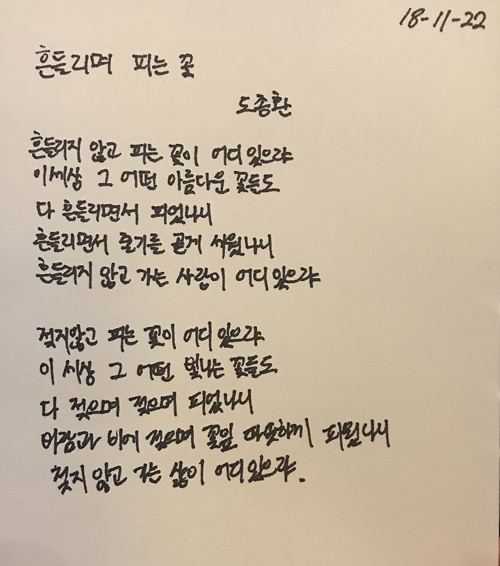 By 사노라면 흔들리며 피는 꽃 도종환 흔들리지 않고 피는 꽃이 어디 있으랴 이 세상 그 어떤 아름다 사랑시 손글씨 문구 좋은 시